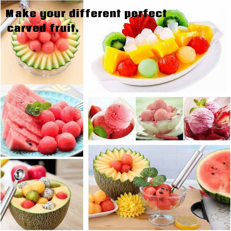 Create perfect fruit garnishes with the 2 In 1 Stainless Steel Fruit Carving Knife & Ice Cream Scoop.With a scooping head on one end and carving knife on the other, your possibilities are endless. Scooper comes with a small hole on back of sphere to help coax fruit out without getting damaged. Slice, cut & scoop vegetables, cookies, cakes, watermelon & more. A great tool for every kitchen!